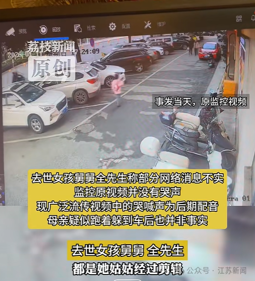 据荔枝新闻,去世女孩舅舅全先生称,部分网络消息不实,监控原视频并没有哭声,现广泛流传视频中的哭喊声为后期配音,母亲疑似跑着躲到车后也并非事实。