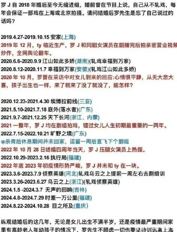 有网友整理了罗晋自2018年结婚以来的作品拍摄地,发现五年内他只有一部作品是在上海拍摄的,而当时唐嫣正在内蒙古拍摄《燕云台》。