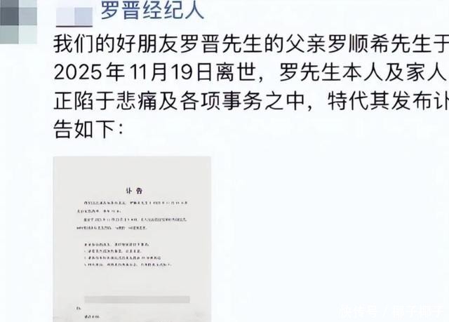 11月20日,罗晋的经纪人发布讣告,宣布罗晋的父亲罗顺希先生已于11月19日在北京离世,享年70岁。